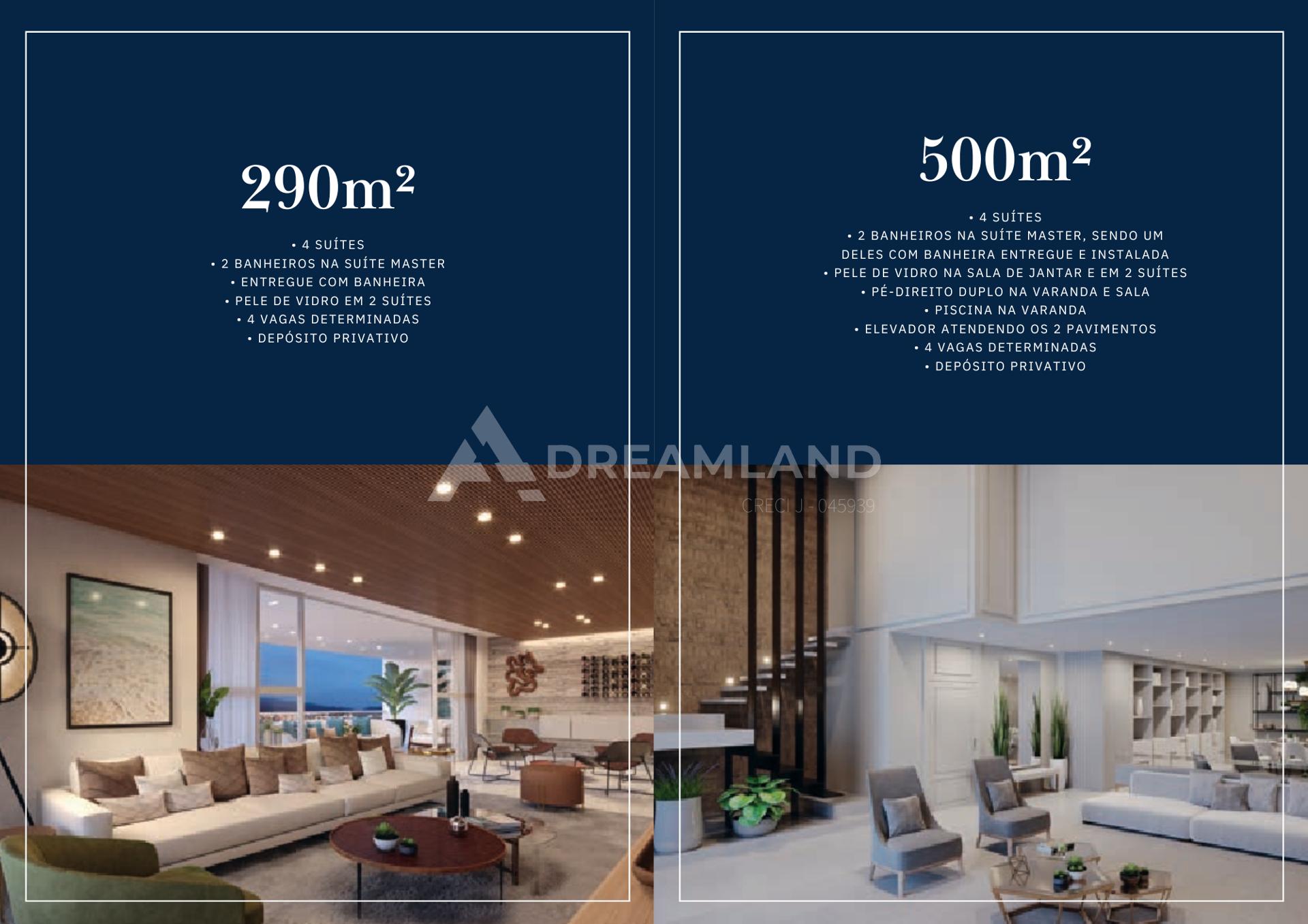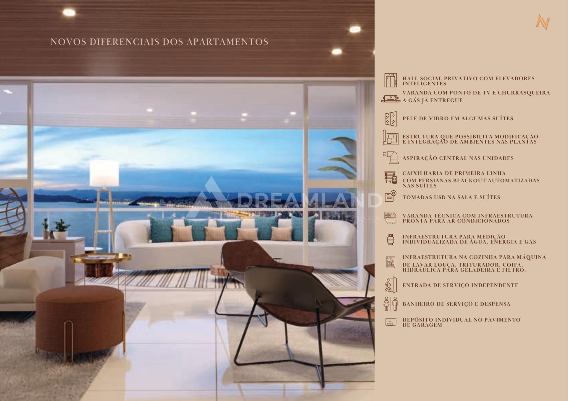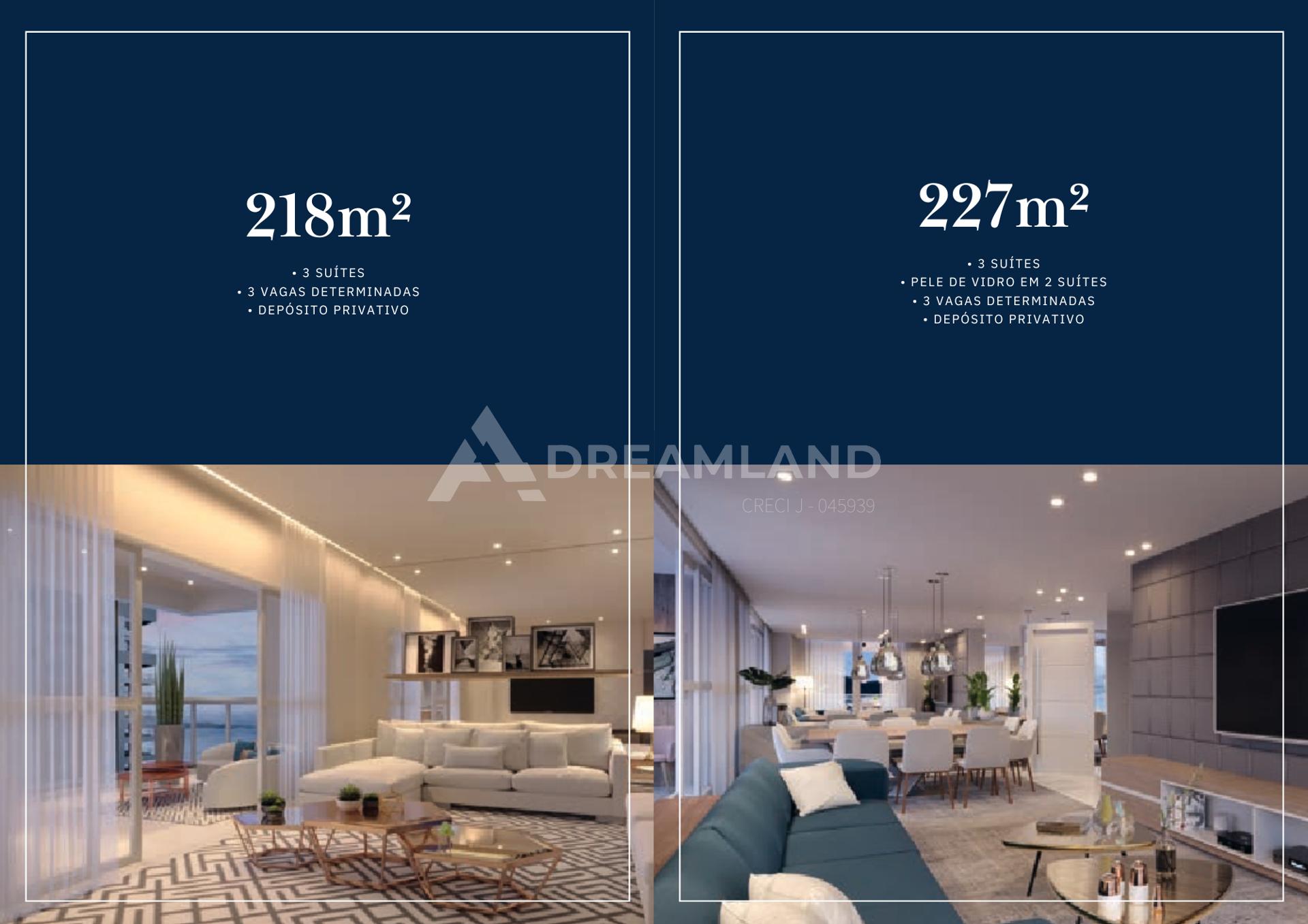 TUDO DO JEITO QUE VOCÊ PLANEJOU 218m² 3 Suítes 3 Vagas determinadas Depósito privativo 227m² 3 Suítes Pele de vidro em 2 Suítes 3 Vagas determinadas Depósito privativo Áreas comuns entregues totalmente decoradas e equipadas Fechadura eletrônica nas áreas comuns Tomadas usb nas áreas comuns Infraestrutura para carregamento de carro elétrico na garagem Depósito náutico Estacionamento para carros, motos e bicicletas personalizados Docas para serviços e espaço delivery Gerador para atender , sistemas de seguranças e elevadores